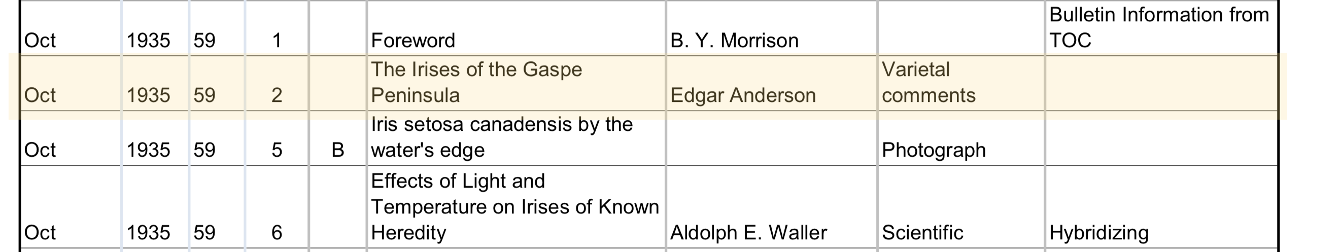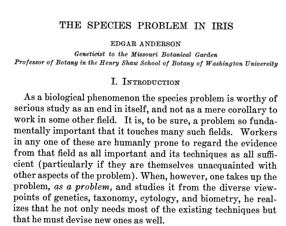 Edgar Anderson (1935) "The irises of the Gaspe Peninsula" Bulletin of the American Iris Society, 59, 2-5.