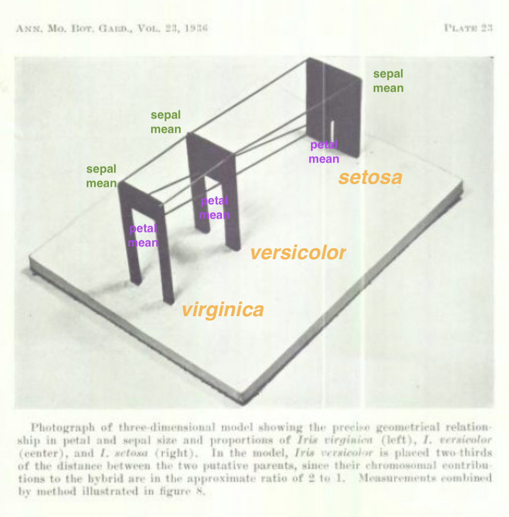 "The sample of the third species given in Table I, Iris virginica, differs from the two other samples in not being taken from the same natural colony as they were." Fisher, 1936