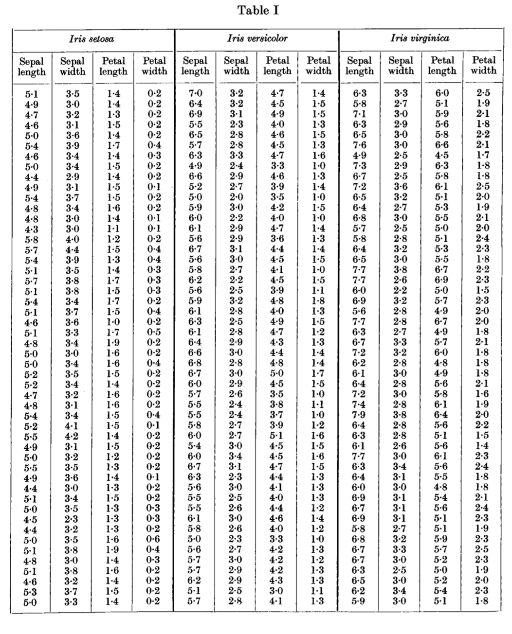 "Table I shows measurements of the flowers of fifty plants each of the two species Iris setosa and I. versicolor, found growing together in the same colony and measured by Dr E. Anderson, to whom I am indebted for the use of the data." Fisher