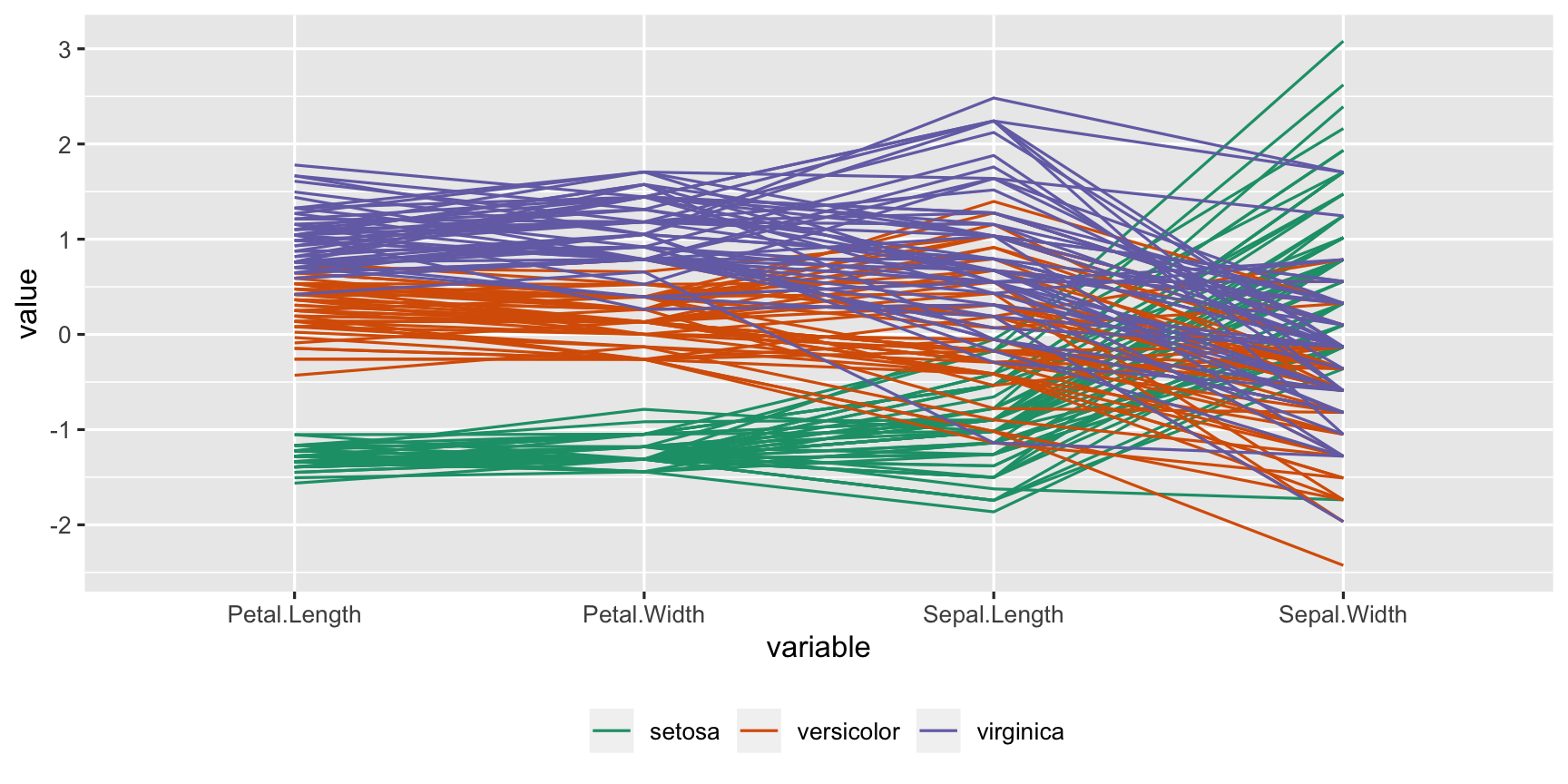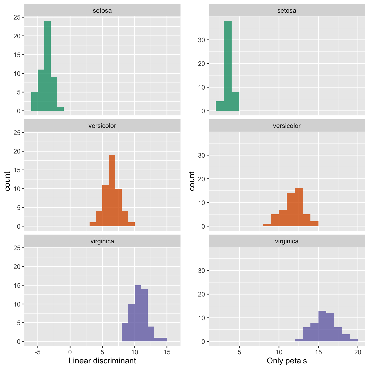 ## LD1## Sepal.Length -0.1928034## Sepal.Width -0.8492086## Petal.Length 3.1053092## Petal.Width 1.7156500Mostly, petal length and width needed to separate the (two) species.