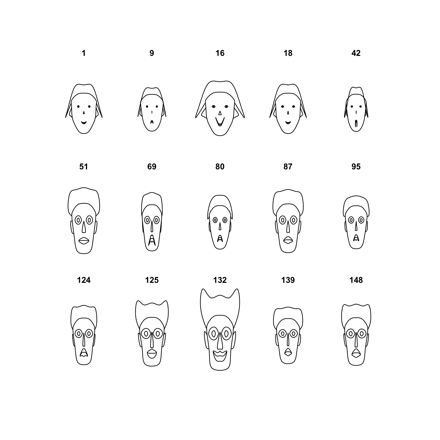 1-height of face, 2-width of face, 3-shape of face, 4-height of mouth, 5-width of mouth, 6-curve of smile, 7-height of eyes, 8-width of eyes, 9-height of hair, 10-width of hair, 11-styling of hair, 12-height of nose, 13-width of nose, 14-width of ears, 15-height of ears