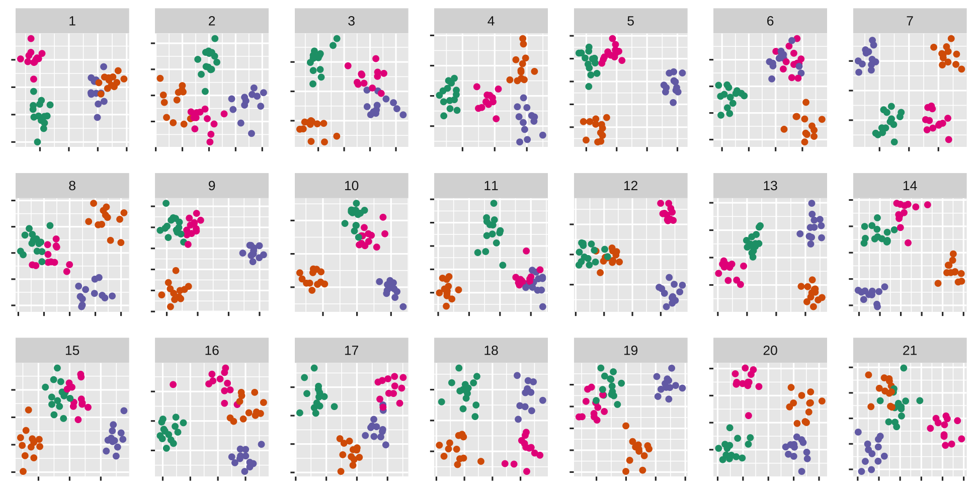 set.seed(20200624)library(nullabor)l <- lineup(null_permute("sighted"), rsf1, n=6)ggplot(l) + geom_point( aes(x=x, y=y, colour=sighted), alpha=0.3) + facet_wrap(~.sample, ncol=2) + extra nice styling
