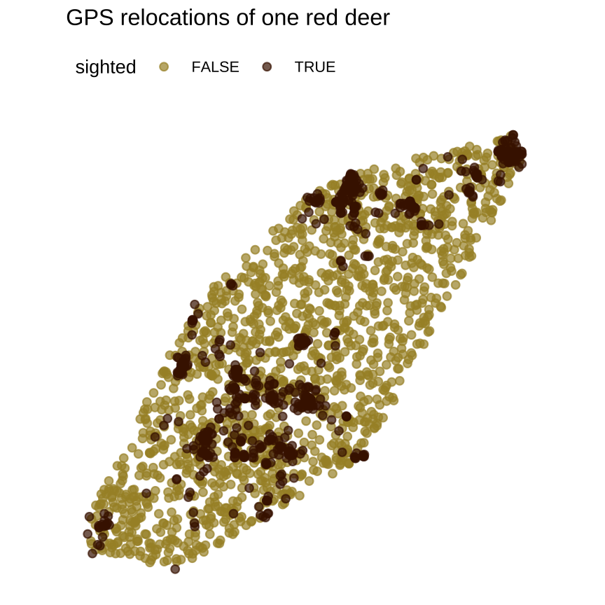 # Get some datalibrary(amt)data("deer")data("sh_forest")rsf1 <- deer %>% random_points(n=1500) %>% extract_covariates(sh_forest) %>% mutate(forest = sh.forest == 1) %>% rename(x=x_, y=y_, sighted=case_)# Plot itggplot(data=rsf1) + geom_point( aes(x=x, y=y, colour=sighted), alpha=0.7) + extra nice styling