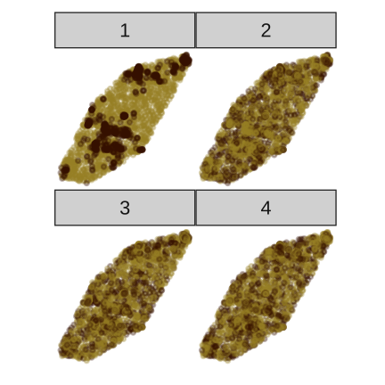 set.seed(20200624)library(nullabor)l <- lineup(null_permute("sighted"), rsf1, n=6)ggplot(l) + geom_point( aes(x=x, y=y, colour=sighted), alpha=0.3) + facet_wrap(~.sample, ncol=2) + extra nice styling