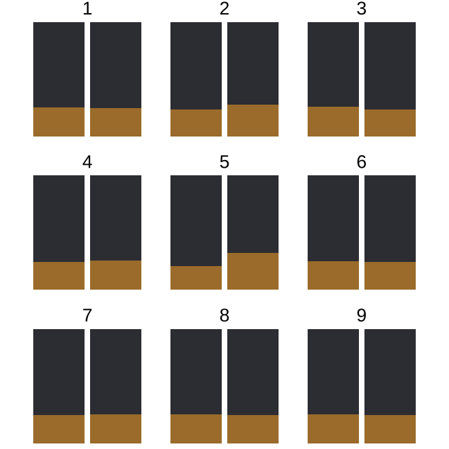 set.seed(20200625)l <- lineup(null_permute("sighted"), rsf1, n=9)ggplot(l) + geom_bar( aes(x=sighted, fill=forest), position = "fill") + facet_wrap(~.sample, ncol=3) + extra nice styling