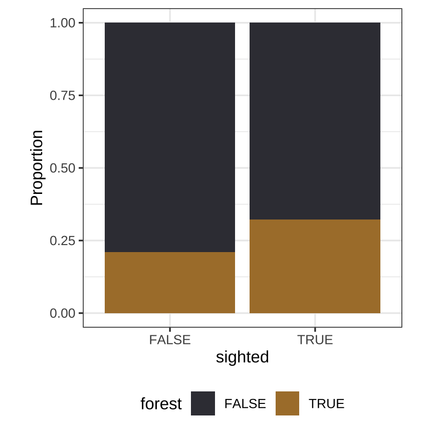 ggplot(DATA) + geom_BAR( aes(x=sighted, fill=forest), position = "fill") + extra nice styling