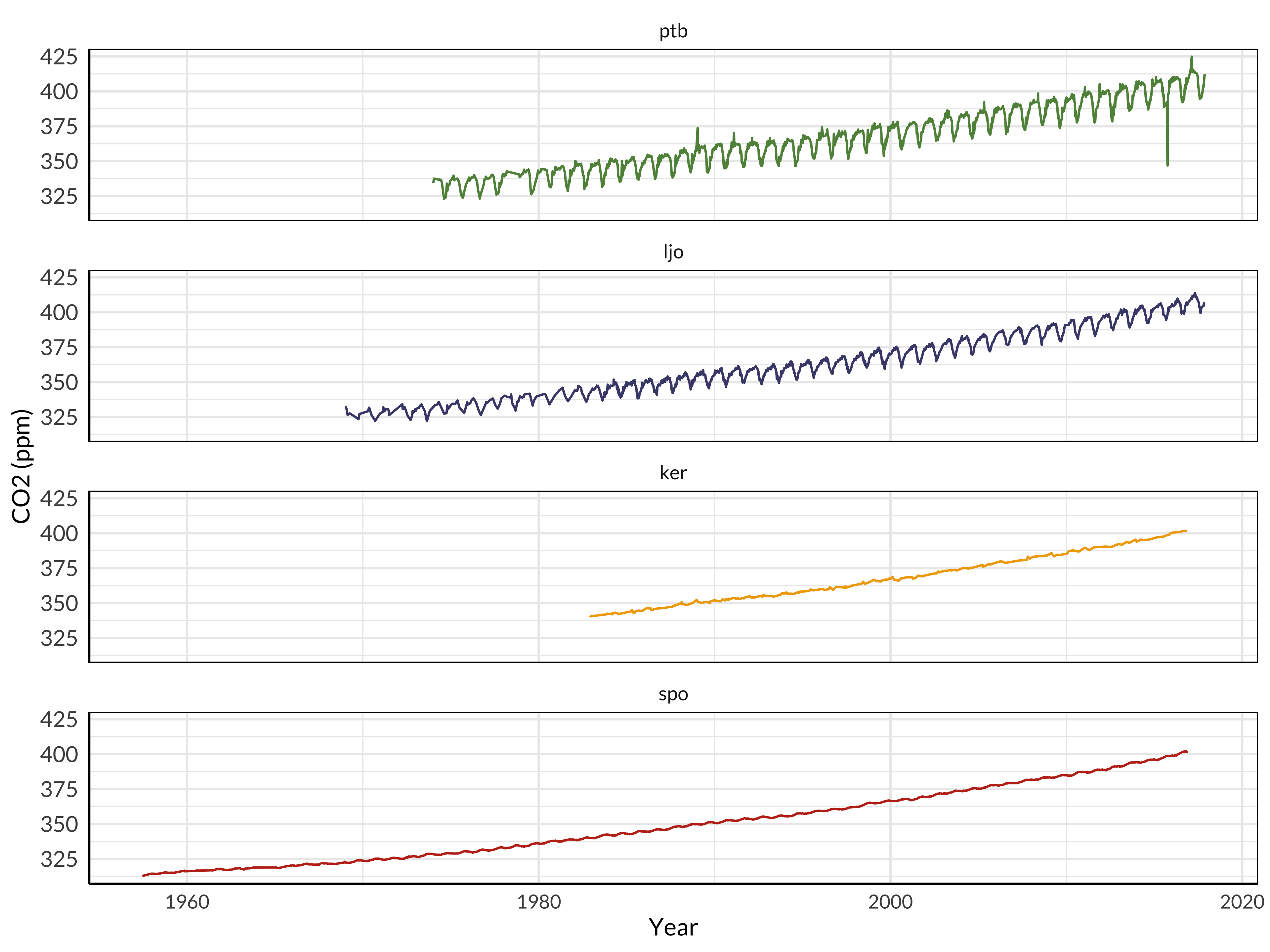 CO\(_2\) is seasonal in the northern hemisphere, and increasing everywhere. (Open data is available from Scripps.)